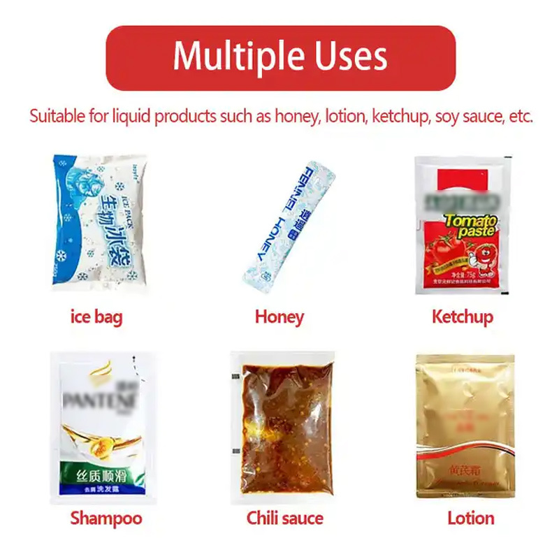 liquid packing machine is suitable for the packaging of various liquid and sauces, such as soup,edible oil,liquid medicine,cream,seasoning sauce,honey,shampoo and shower gel etc.